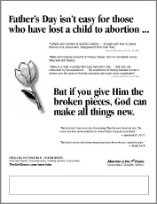 The Fatherhood Forever Foundation is dedicated to helping men find healing and hope after abortion by creating awareness that abortion does have an impact on men and providing encouragement to those seeking help. Lists resources, including books, articles and healing/support organizations.